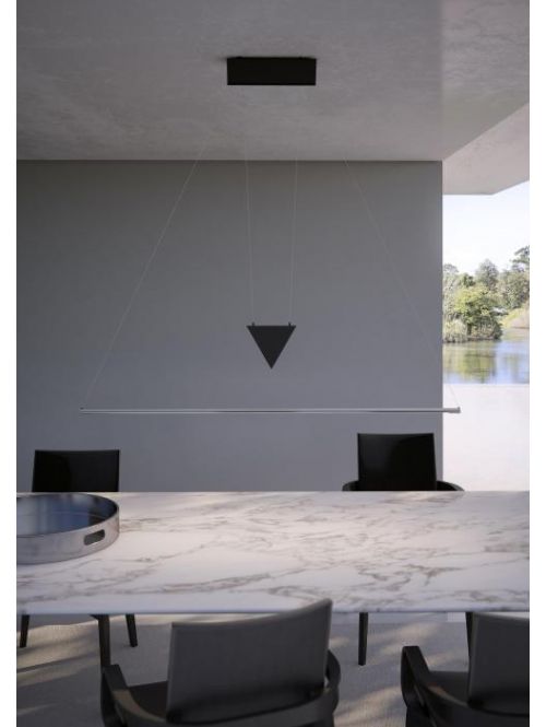 The Betec Filum is a height-adjustable pendant lamp with touch dimmer and counterweight. The lamp can be rotated 360 degrees for directed lighting. By touching the pin on the lamp, the light can be switched and dimmed continuously. The pendant lamp is suitable for any ceiling height, as the cable lengths can be individually adjusted with a geometric counterweight. The Filum by Betec is produced from brass and then glossy chrome-plated. The pendant light is offered with a length of 89.1 cm, 119.1 cm and 149.1 cm. The lamp has a width of 1.8 cm for each length. The canopy and the counterweight are both in black.