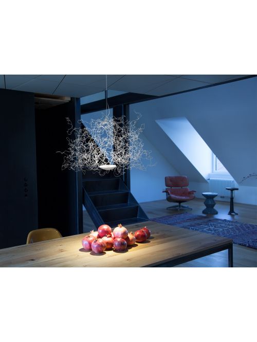The SirSimon by Lichtlauf floats in space like a three-dimensional free sketch. Each lamp consists of about 80 metres of copper wire, which is formed into a volume by hand and soldered. This special manufacturing process makes each SirSimon unique. The coating combines the structure into a luminous cloud. Part of the light of this light sculpture is emitted powerfully downwards, the rest is gently distributed upwards. The SirSimon pendant luminaire is perfectly suitable for glare-free illumination of tables, but also as a light sculpture in many other areas. The integrated LED with an output of 12 watts has a colour temperature of 3,000 Kelvin. The light of the integrated LED is characterised by very good colour rendering with a high colour rendering index of Ra 90. This height-adjustable LED lamp is available in white coated and silver tinned finishes. This handcrafted light sculpture is approx. 50 cm high, has a diameter of approx. 60 cm to 80 cm and has a maximum pendant length of 250 cm. Special sizes and colours are available on request. In addition, the SirSimon is also available in other pendulum lengths (up to a maximum of 700 cm) on request.