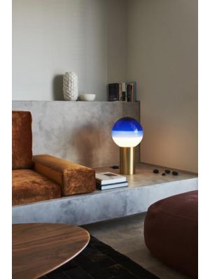 The Marset Dipping Light is available in two sizes: with a total height of 22.2 cm or 54 cm (M). Both lamps have a brushed brass base and a hand-blown glass shade. The shade has several layers of colour in concentric circles that merge barely noticeably. When switched on, the light is coloured differently by these different layers of colour. The colour layers are clearly visible even when the light is switched off. The table lamps of this series are available in pearl white, black, blue, green, pink and amber surfaces. An LED is integrated as a light source. The smaller Dipping Light is regulated with a switch on the supply line, the larger M version with a cord dimmer.