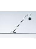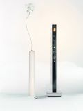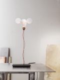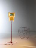 The Ingo Maurer 24 Karat Blau T table lamp was designed by Axel Schmid in 2005. The shapely shade consists of the finest gold leaf incapsulated into transparent acrylic glass. The delicate metal rods hold the light shade together. The 24 Karat Blau T table lamp shimmers mysteriously blue which is a spectacular effect created by the gold foil as all other colours are absorbed. The golden shades of this table lamp come with four precut holes. With these you may hang the lamp at a cross out of rods in different angles. The red frame of the Ingo Maurer 24 Karat Blau T consists of metal forming a nice contrast.